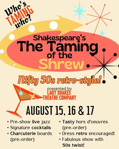 This is the 5th Lady Shakes full length production Mary has costumed. She has had a blast costuming this Lady Shakes production of Taming of the Shrew. She is a big 1950’s vintage clothes (and music) fan and Taming of the Shrew is her favorite Shakespeare comedy. Enjoy the show.